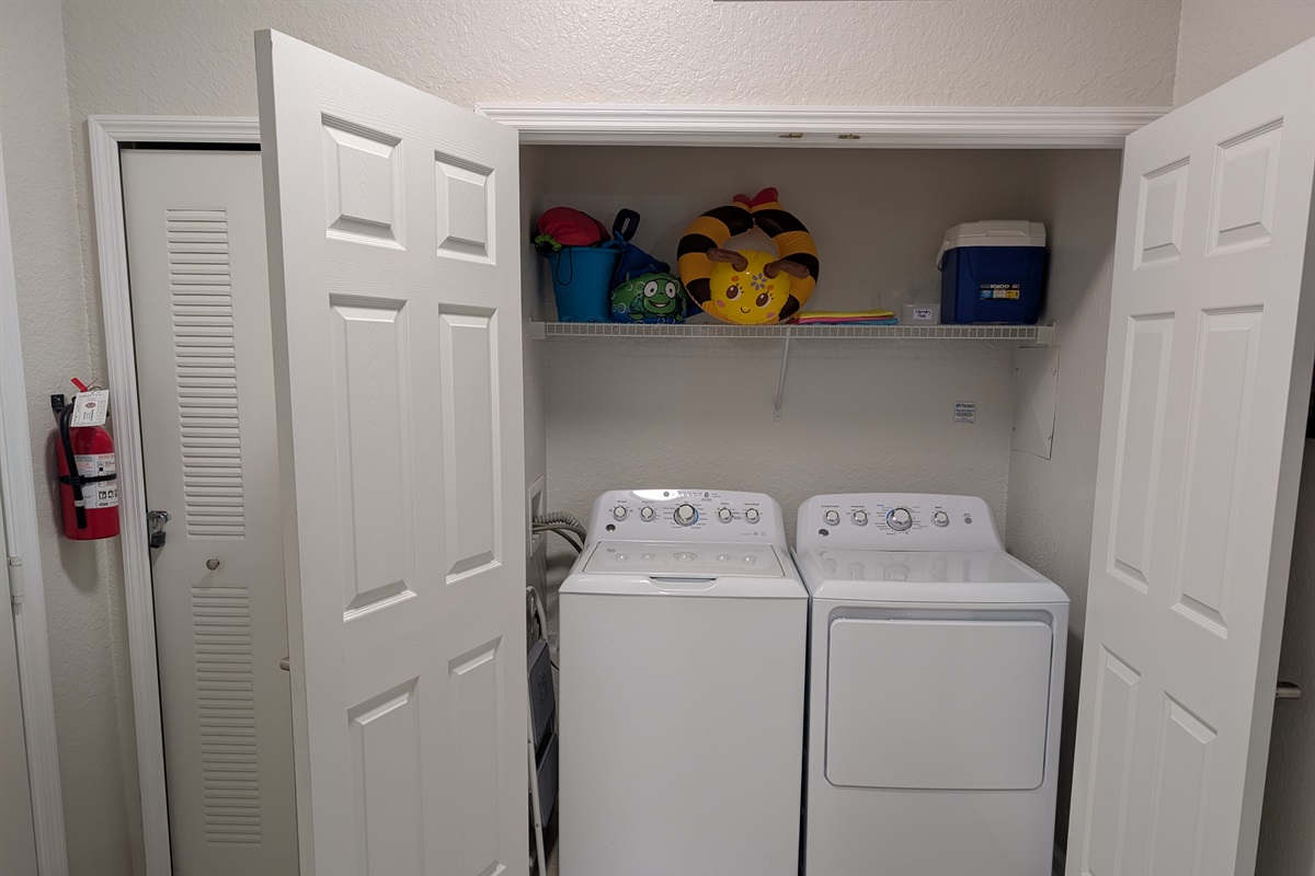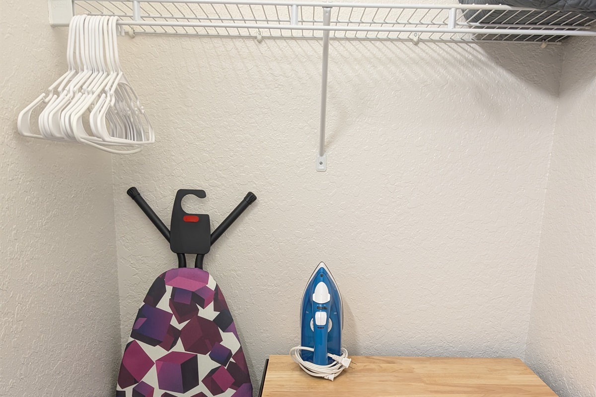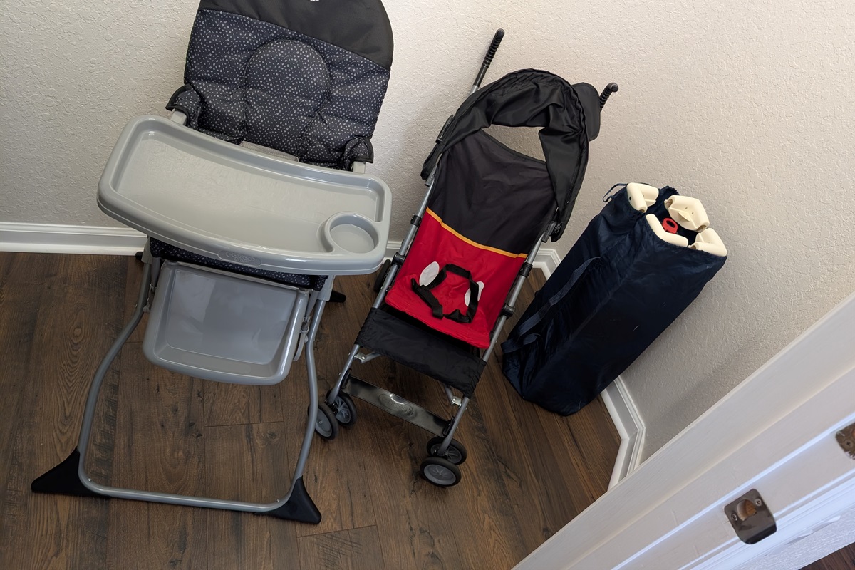 • Large walk-in closet with family essentials: portable crib, umbrella stroller, and high chair